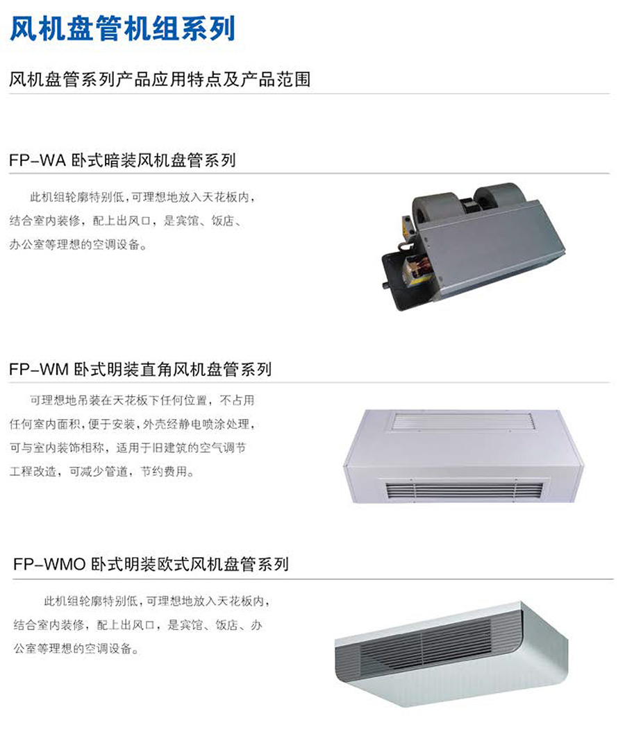 風(fēng)機(jī)盤(pán)管機(jī)組主要由風(fēng)機(jī)、熱交換器(盤(pán)管)、凝水盤(pán)、殼體及控制器組成,它適用于集中式空調(diào)系統(tǒng)。設(shè)計(jì)先進(jìn)、品種齊全、性能優(yōu)越,用途廣泛,通常用于要求噪聲小,溫度調(diào)節(jié)靈活的各種賓館、公寓、飯店、醫(yī)院、商業(yè)大樓等。