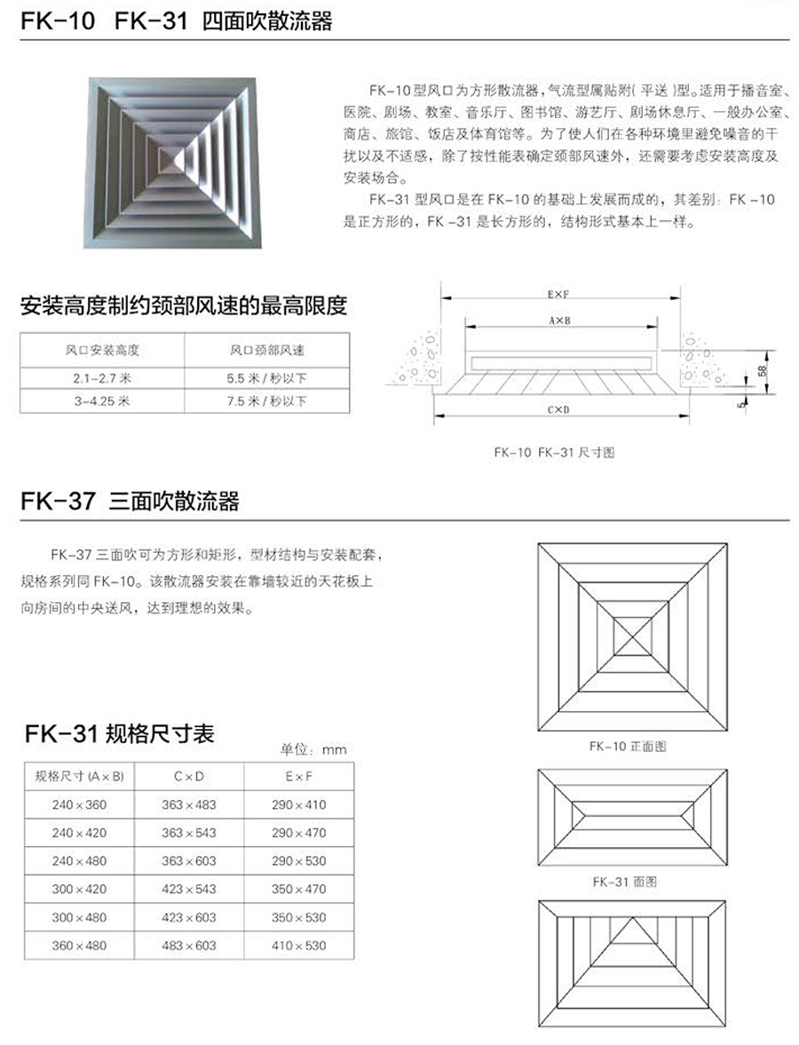 方形散流器(鋁合金散流器)優(yōu)點(diǎn)及適用范圍:氣流屬貼附(平送)型,適用于播音室、醫(yī)院、劇場(chǎng)、教室、音樂(lè)廳、圖書館、游藝廳、劇場(chǎng)休息廳、一般辦公室、商店、旅館及體育館等。為了使人們?cè)诟鞣N環(huán)境下避免噪音的干擾以及不適感,除了按性能表確定頸部風(fēng)速外,還需要考慮安裝高度及安裝場(chǎng)合。方型散流器使用該類型散流器時(shí)要與調(diào)節(jié)閥配合使用,才能在系統(tǒng)中得到理想的氣流分布。此風(fēng)口的葉片角度為固定式,不能隨意調(diào)節(jié),整個(gè)葉片與邊框采用分離結(jié)構(gòu) (即葉片可以從邊框內(nèi)取下,安裝好邊框后再裝上葉片),以方便安裝與調(diào)節(jié)。