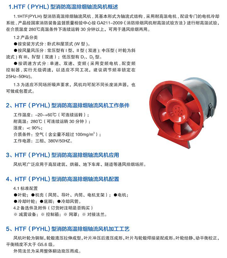 消防排煙風機主要有葉輪,機殼,集流器,導流片,電動機等部件組成。葉輪采用有子午加速特點的扭曲翼形葉片焊接在輪殼上,經(jīng)動平衡檢驗,超速測驗,有良好的空氣動力性能。