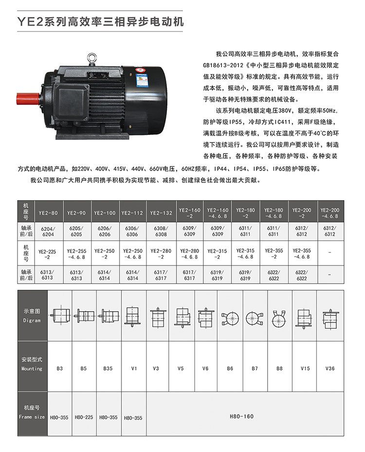 我公司高效率三相異步電動機,效率指標(biāo)符合GB18613-201《中小型三相異步電動機能效限定值及能效等級》標(biāo)準(zhǔn)的規(guī)定。該系列電動機具有高效節(jié)能,運行成本低,振動小,噪聲低,可靠性高等特點,適用于驅(qū)動各種無特殊要求的機械設(shè)備。 該系列電動機額定電壓380V,額定頻率50Hz,防護(hù)等級IP55,冷卻方式IC411,采用F級絕緣,滿載溫升按B級考核,可以在溫度不高于40℃的環(huán)境下連續(xù)運行。我公司可以按用戶要求設(shè)計,制造各種電壓,各種頻率、各種防護(hù)等級、各種安裝方式的電動機產(chǎn)品,如220V、400V、415V、440V、660V電壓,60Hz頻率,IP44、IP54、IP55、IP65防護(hù)等級等。 我公司愿和廣大用戶共同攜手積為實現(xiàn)節(jié)能、減排、創(chuàng)建綠色社會做出大貢獻(xiàn)。