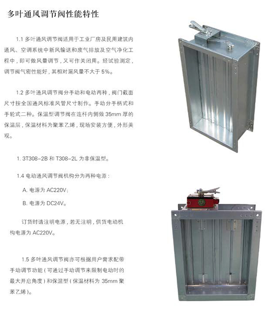 通常分為常開電動式、常開手動式、常閉電動式三種,均可輸出關(guān)閉電信號及啟動連鎖,熔斷關(guān)閉溫度均為280℃,風(fēng)閥均可調(diào)節(jié)開度。